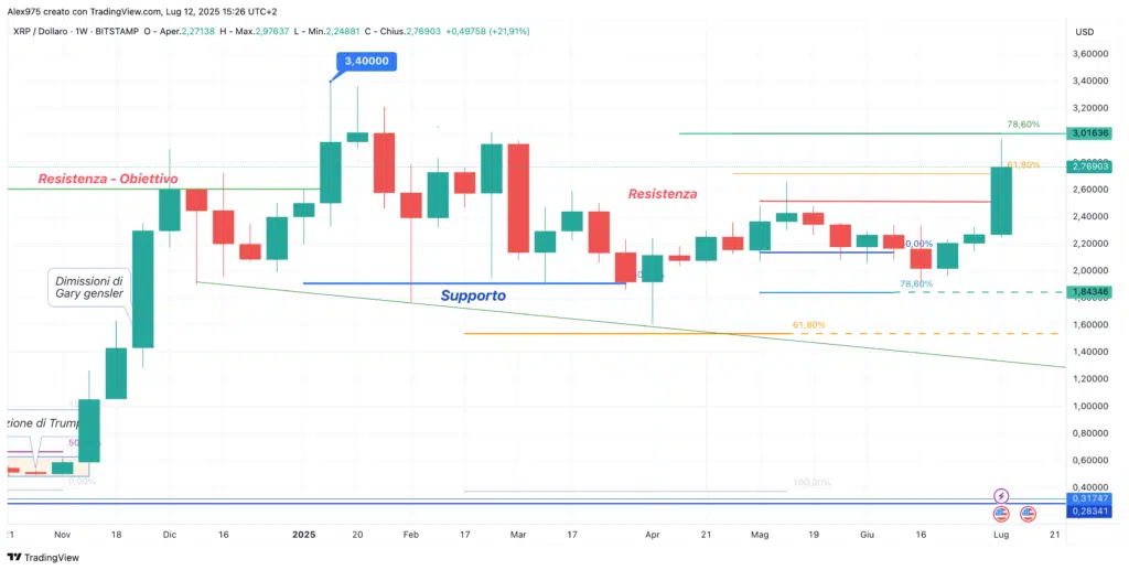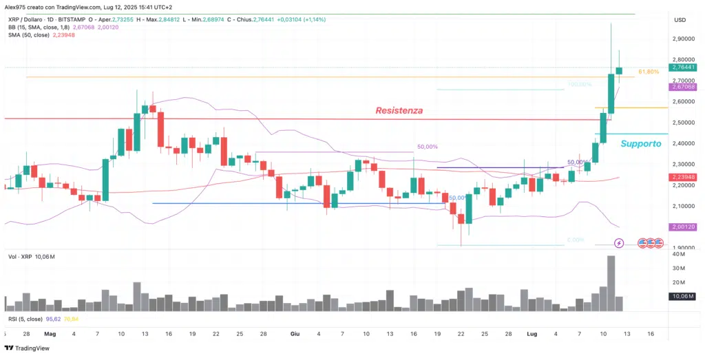 Analizzando lo scenario tecnico sul grafico daily, si evidenzia chiaramente questa fase di breakout, che si è verificata in modo deciso, spingendo Ripple nella giornata di ieri fino a un massimo tra 2,97363 USD. Con questa accelerazione, XRP ha anche superato la resistenza-obiettivo precedentemente segnalata nella nostra analisi del 3 luglio, avvicinandosi ora all’area target principale compresa tra 3,05 e 3,40 USD.