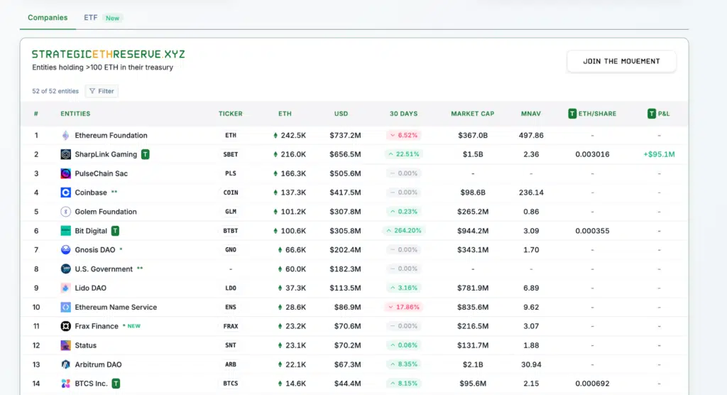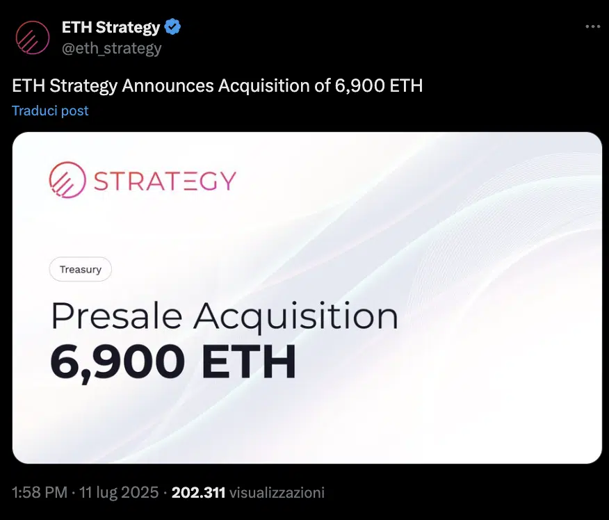Chi è questo “qualcuno”? In primis SharpLink Gaming, società quotata in borsa negli USA che sta seguendo le orme di Strategy, ma applicando la teoria sulla moneta di Vitalik Buterin invece che su Bitcoin. Pochi giorni fa l’azienda ha acquistato 10.000 ETH direttamente dall’Ethereum Foundation, portando le sue riserve a 216.000 coins. Ora rappresenta la seconda entità con più monete in custodia, dopo la Foundation stessa.