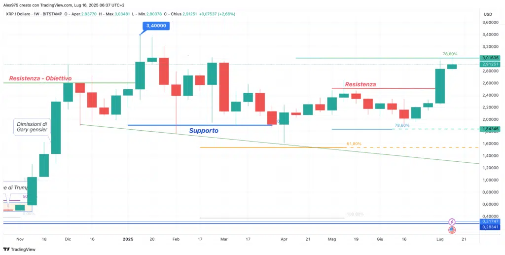 In corrispondenza di questo livello, il prezzo ha subito un nuovo arresto e ha avviato un’ulteriore correzione, culminata con un ritorno sull’area di $1,90 a fine giugno. Da qui, XRP ha reagito nuovamente al rialzo, portando infine al breakout della resistenza a $2,50, già segnalato come livello chiave nell’analisi del 4 aprile.