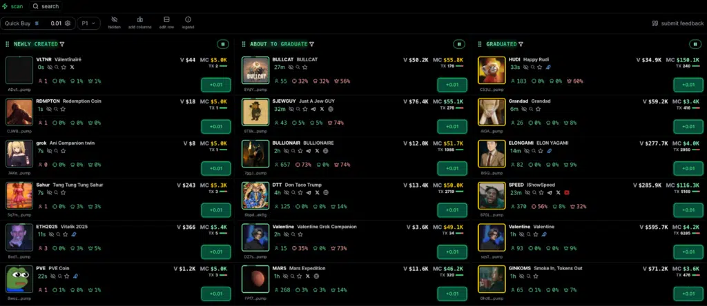 Su PumpFun c’è anche una sezione particolare per il trading avanzato, che permette di eseguire “quick buy”, ossia acquisti rapidi, direttamente dalla homepage senza dover aprire manualmente la pagina del token. È una pratica utile per chi cerca di fare sniping delle coins appena lanciate, provando a sfruttare il fattore tempo.