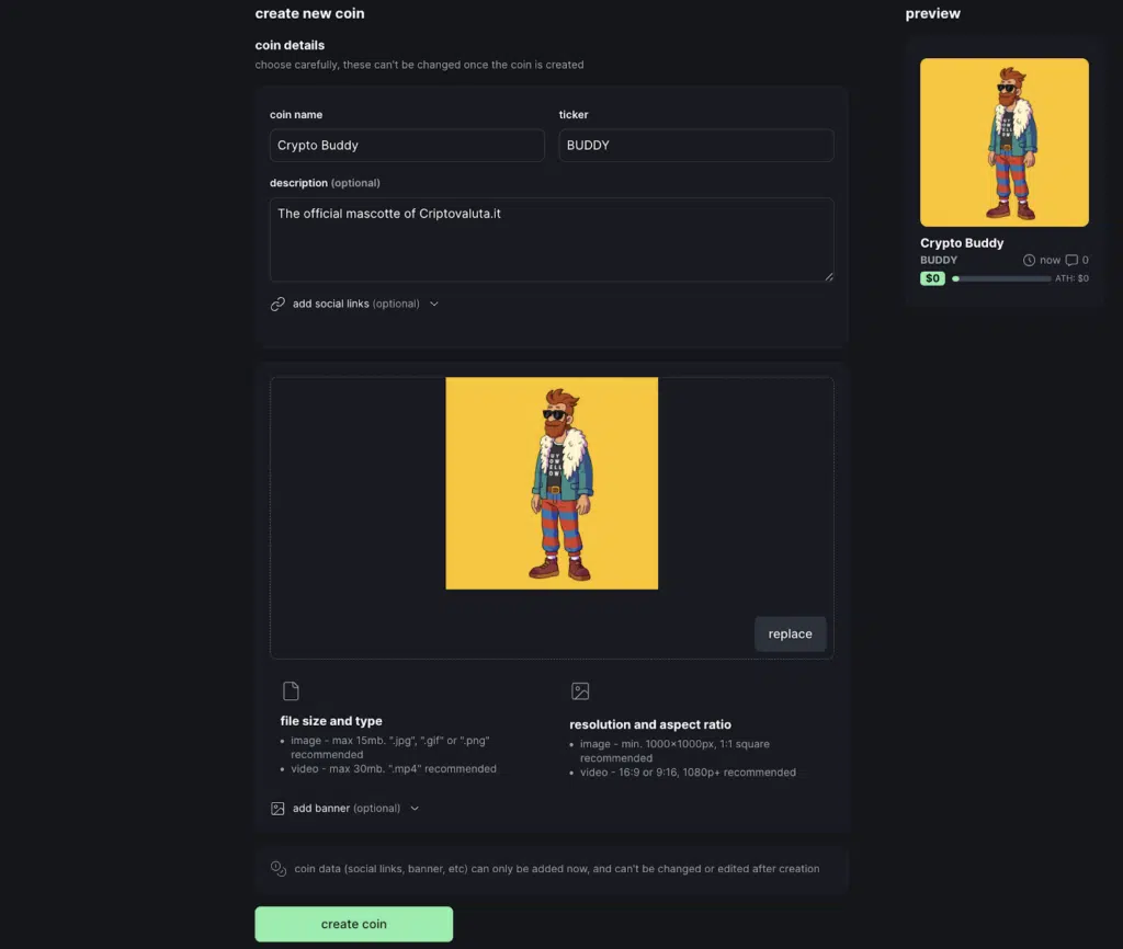 Per creare una propria moneta basta andare sulla voce “create coin”, inseriamo un nome, un ticker, una descrizione ed una foto in formato jpeg, gif o png. Per scopi didattici abbiamo creato una memecoin chiamata Crypto Buddy, in onore della nostra mascotte ufficiale, se non l’hai ancora conosciuta, ecco dove puoi seguire le sue folli gesta.