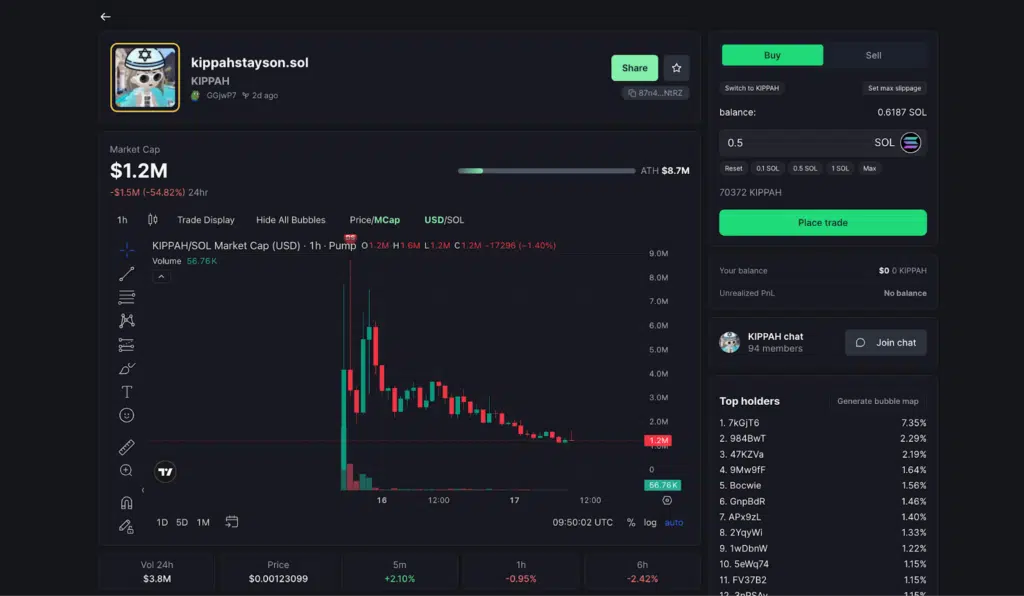 Cliccando su una delle opzioni che appaiono su PumpFun, come nel nostro caso la memecoin “kippahstayson.sol (KIPPAH)”, passiamo direttamente alla sezione di trading per completare l’operazione. Molto semplice ed intuitivo, basta selezionare la quantità di SOL che intendiamo acquistare e cliccare su “place trade”. Stesso discorso per vendere la moneta: cliccando su sell, inserendo la quantità, e poi ancora su “place trade”.