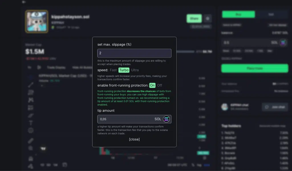 Senza scendere troppo nei dettagli tecnici, basta cliccare su “on” alla voce “enable front-running protection” ed impostare la tips da cedere ai validatori, indicativamente tra 0,05 e 0,1 SOL. Considerate l’idea di usare questa protezione se avete intenzione di acquistare una memecoin con size elevata. Con ordini di poche decine di dollaro potete tranquillamente evitare, senza correre grossi rischi.