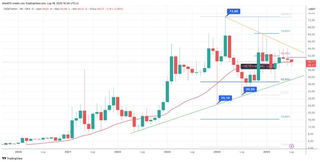 Sul grafico monthly di OKB abbiamo una panoramica che parte dal 2022 dove si può osservare un trend rialzista, con una serie di massimi e minimi crescenti. Un’importante fase di rialzo si è avuta a inizio 2023 e successivamente anche a inizio 2024, quando è stato toccato un ATH a 73,88 USDT nel mese di marzo. Da lì è seguita una fase discendente del prezzo, proseguita fino all’estate 2024, con un minimo a 30 USDT e un relativo rimbalzo che ha portato il prezzo a toccare un massimo di 64,26 USDT a dicembre.
