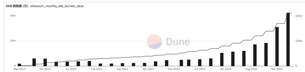 Il boom del prezzo di $OKB è dovuto al suo percorso di riduzione della supply che costituisce uno degli esempi più significativi di tokenomics deflazionistica nel panorama delle crypto. Lanciato con una max supply di 300 milioni di token, OKB è stato oggetto fin dal 2019 di un programma sistematico di buy-back e burn con cadenza regolare, finanziato dai profitti generati da OKX. Ogni trimestre, parte delle entrate veniva destinata all’acquisto di token sul mercato, successivamente eliminati in modo permanente.