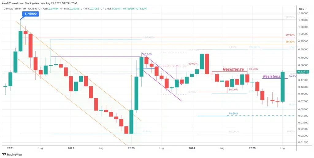 Al momento di questa stesura, Conflux quota 0,2269 USDT ed il rialzo a luglio registra un +204%, interrompendo quattro mesi in rosso consecutivi. Questo movimento, porta l’andamento da inizio 2025 a +46%, recuperando la chiusura negativa del 2024 a -19% che però seguiva il +788% del 2023.