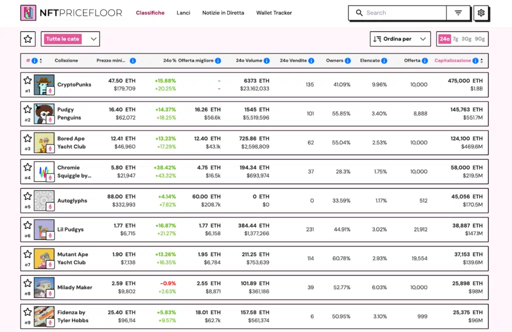 Secondo quanto riportato dalla dashboard di “NFT Price Floor“, il prezzo delle più grandi collezioni non fungible token è schizzato alle stelle nelle ultime ore, alimentando un’ondata di entusiasmo che non si vedeva da tempo. I celebri CryptoPunks, noti per essere tra i primi NFT iconici della blockchain di Ethereum, hanno registrato un aumento del proprio prezzo base del 15,88% nelle ultime 24 ore.. Pensate che una sola whale ha acquistato in lotto 45 pezzi in 2 minuti, spendendo oltre 2.000 ETH per completare l’ordine.