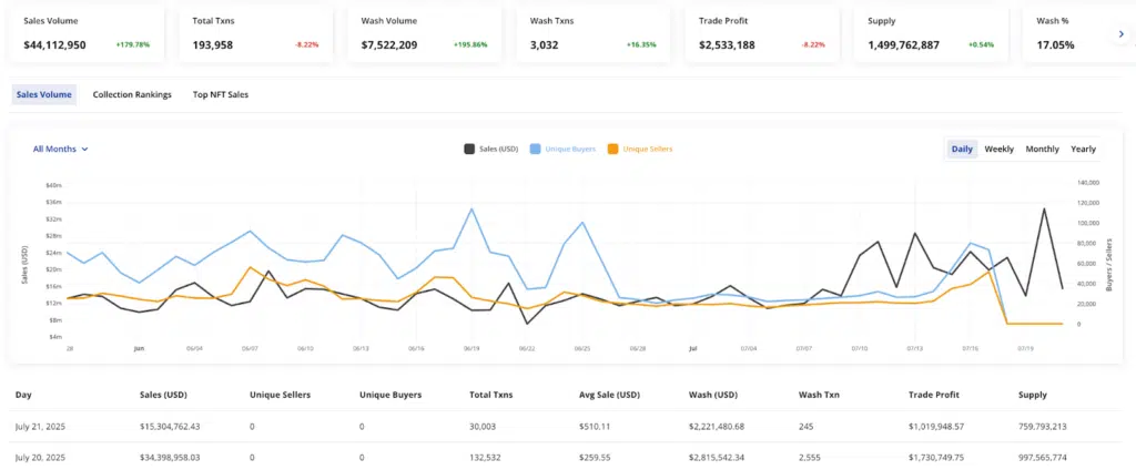 Chiaramente non sono solo i prezzi degli NFT a correre ma parallelamente anche i volumi di scambio, che mostrano il reale interesse degli operatori del mercato. Come evidenziato dai dati di “Crypto Slam”, nella giornata del 20 luglio si sono svolte negoziazioni per $34 milioni, un dato così alto che non veniva registrato ormai da diversi mesi. Nelle ultime 24 ore i volumi salgono a $44 milioni, con una crescita del +179% rispetto alla giornata precedente.
