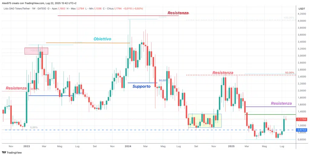 Da quel massimo, LDO ha avviato un trend ribassista durato circa 18 mesi. Anche il rally di fine 2024 non è riuscito a invertire la tendenza, portando il prezzo solo fino a 2,48 USDT. Da lì è iniziata una nuova fase discendente, culminata ad aprile 2025 con un minimo tra 0,6112 USDT, livello che è stato ritestato anche a metà giugno. Proprio da quest’area ha preso avvio l’attuale fase di rialzo.