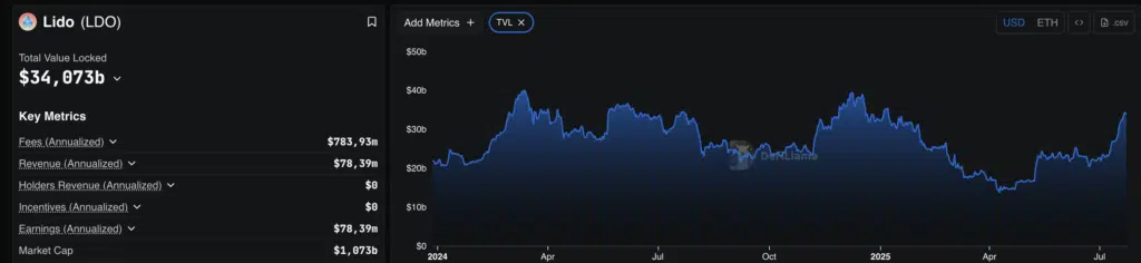 Lido DAO è attualmente il principale protocollo di liquid staking nel settore DeFi, con una TVL di circa 34 miliardi di dollari, in gran parte su Ethereum. Il picco è stato registrato a marzo 2024 con 40, 10 miliardi di dollari.