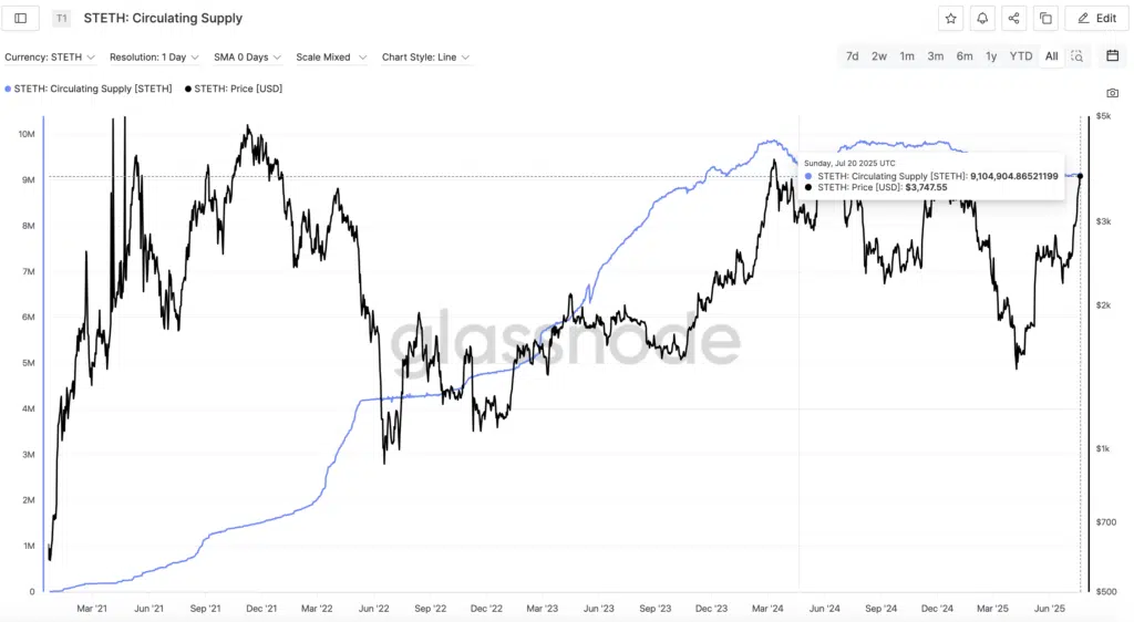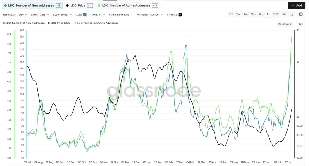 A livello on-chain a luglio si registra un picco di indirizzi attivi e nuovi, indicando rinnovato interesse. Nonostante un lieve calo della quota di mercato e l’avanzata di concorrenti come ether.fi, Lido conserva un ampio vantaggio competitivo grazie alla forte integrazione DeFi e all’adozione istituzionale. Dopo l’aggiornamento Shanghai, gli afflussi di staking si sono stabilizzati, segnando una maturità dell’ecosistema.