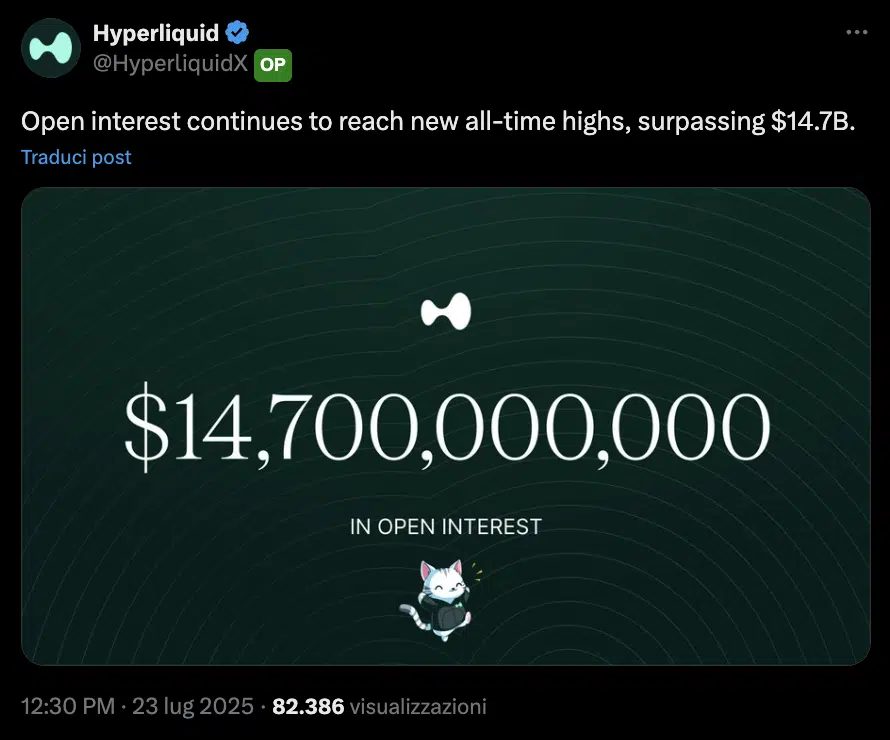 Se infatti da una parte le quotazioni di HYPE hanno mostrato segni temporanei di debolezza, dall’altra il DEX Hyperliquid non sembra aver mai perso l’interesse dei suoi utenti. Poche ore fa è stato raggiunto un nuovo massimo storico di open interest a $14,7 miliardi, segno che evidentemente i traders stanno aumentando le proprie esposizioni sulla piattaforma.