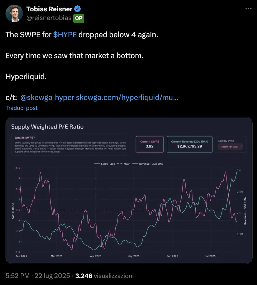 Difficile poter dire con precisione se da adesso in poi Hyperliquid tornerà a crescere sui mercati o ci sarà ancora una fase di contrazione dei prezzi. Quello che possiamo affermare è che alcuni indicatori, tra cui anche alcuni a sfondo economico/fondamentale, ci suggeriscono di rimanere rialzisti su HYPE. Uno di questi è il P/E ratio, che calcola il rapporto tra prezzo del token ed utili generati.