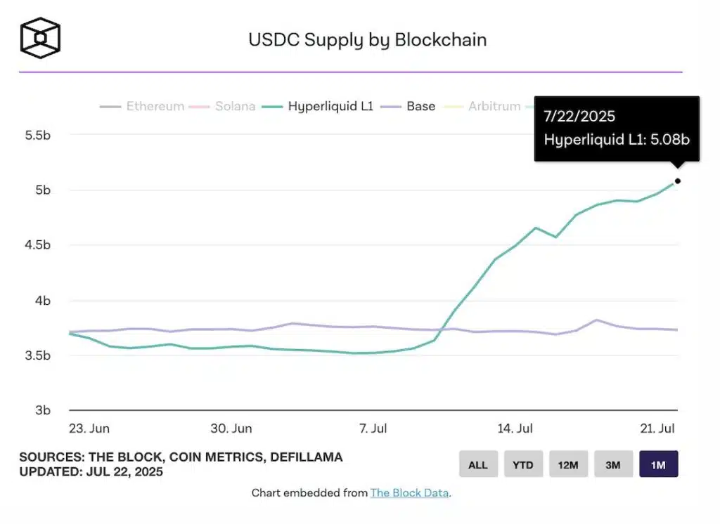 Questa ipotesi appare tuttavia alquanto fuorviante, in quanto se analizziamo i dati on-chain ci accorgiamo che dal 13 luglio ( giorno dell’ATH di HYPE) la rete ha attirato ben $700 milioni di USDC come liquidità. Allo stesso tempo altre chain competitor, come ad esempio Base, hanno visto uscire denaro dalle proprie mura, segno la lieve correzione di HYPE non è dovuta a un abbandono dell’ecosistema, ma piuttosto a una fisiologica presa di profitto.