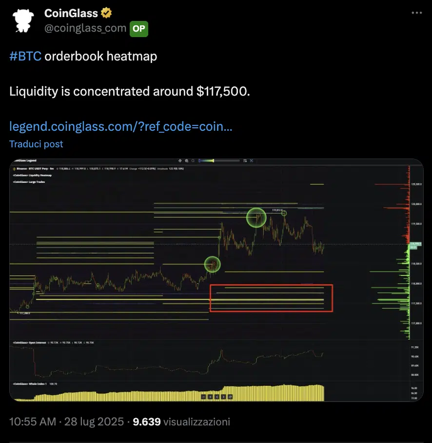 Ciò non esclude comunque la possibilità di un ritracciamento nel breve periodo, a cui dobbiamo essere preparati, quantomeno psicologicamente. Dobbiamo anche essere consci che una buona parte della resilienza di Bitcoin potrebbe terminare alla rottura dei $117.500, dove, secondo quanto riportato da Coinglass, si cela molta liquidità latente pronta a fare il suo ingresso.