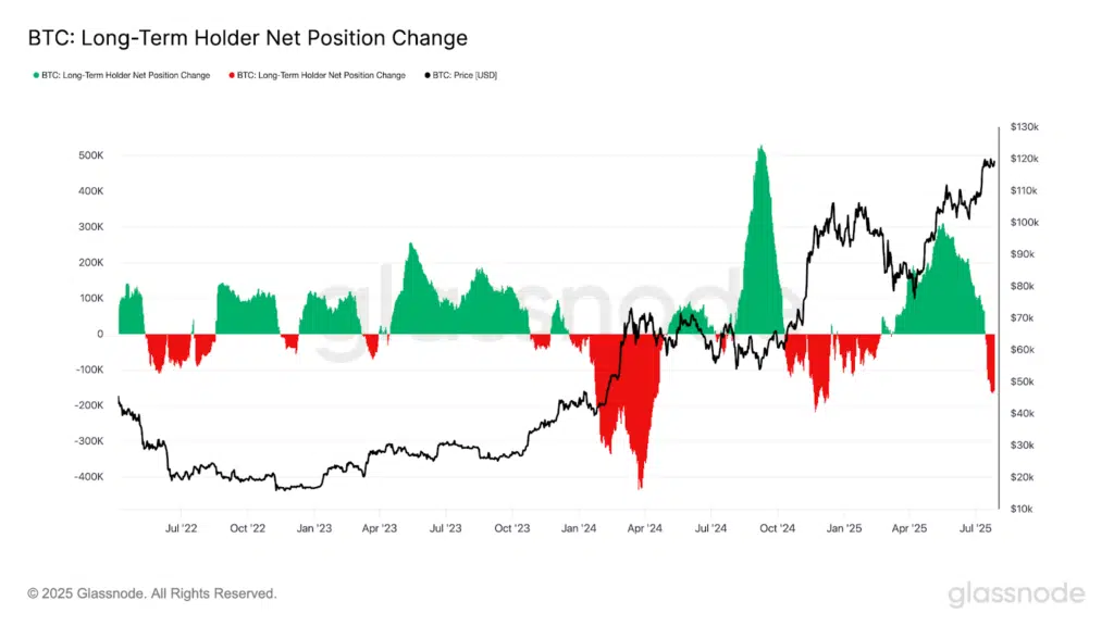 Mentre negli exchange si fa incetta di Bitcoin, dai dati on-chain arrivano dati contraddittori che mettono in luce l’altro lato della medaglia. I long-term holders, ossia tutte quelle entità che non spostano le proprie coins da almeno 155 giorni, sono tornati in saldo negativo dal 15 luglio. Che significa? che stanno vendendo più BTC di quanti ne stiamo accumulando.
