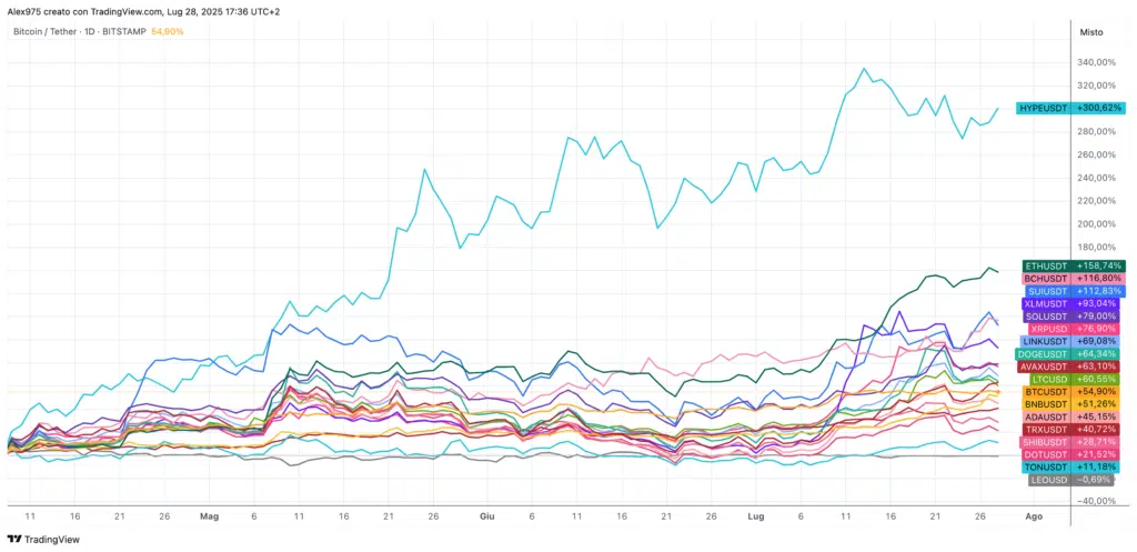 In questo scenario, dove la market cap complessiva del mercato crypto ha segnato un nuovo massimo storico a 4 trilioni di USDT (come approfondito in questo articolo del direttore Alessio Ippolito), il contributo principale all’incremento è arrivato proprio da Ethereum, con un +57,60% da inizio luglio, ben oltre il +19,77% di Bitcoin. Anche la TOTAL3 ha registrato un solido +26,65%, segnalando un crescente coinvolgimento nel comparto altcoin.
