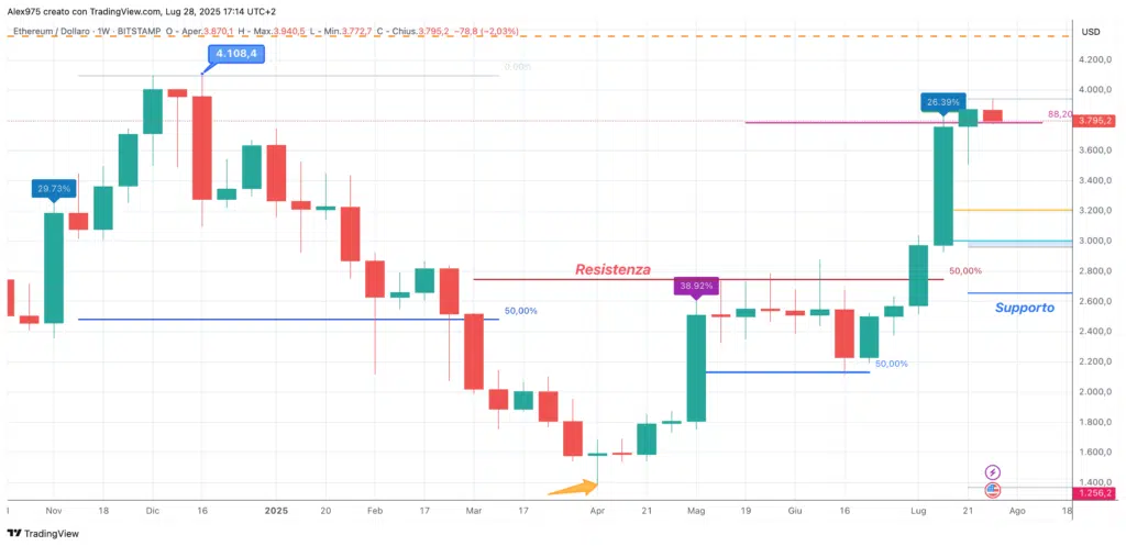 Il grafico weekly di Ethereum ormai è familiare a molti trader, che ne conoscono le candele settimanali a memoria. Qui abbiamo una panoramica dal massimo di a dicembre 2024 a 4.108$, seguito da una netta fase discendente culminata nel minimo di aprile 2025 a quota 1.385 USD. Da quel livello è iniziato il rally ancora in corso.