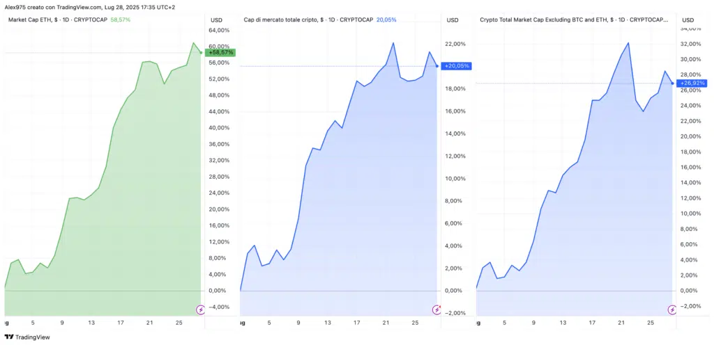 In allegato è riportato l’andamento della market cap di Ethereum da inizio luglio, confrontato con quello di Bitcoin e della TOTAL3 — ovvero la capitalizzazione del mercato crypto esclusi BTC ed ETH.