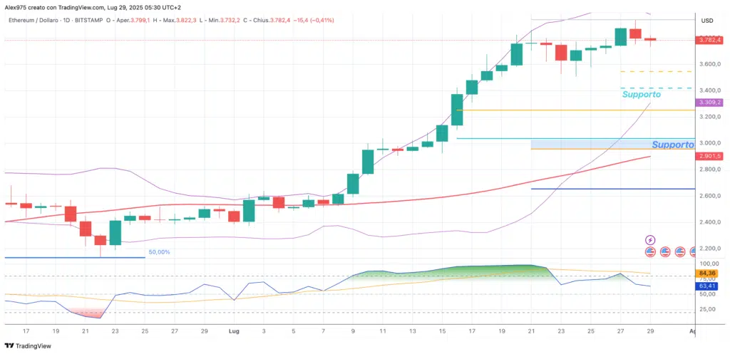 In questo contesto, il primo livello di supporto di breve si colloca a 3.550 USDT, mentre il supportopiù rilevante è in area 3.420 USDT.