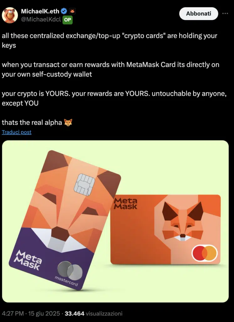 A proposito della carta Metamask, l’ultima integrazione con Aave ha un’implicazione anche sul modo con cui queste crypto possono essere usate nella vita di tutti i giorni. Infatti, oltre ai rendimenti nativi in stable, gli utenti potranno spendere direttamente dalla carta i token aUSDC (Aave USDC), che rappresentano la porzione di USDC depositata in lending.