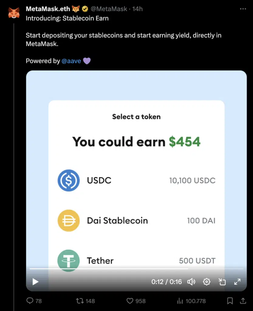 Uno di questi segnali è arrivato proprio poche ore fa con l’annuncio della collaborazione tra Metamask ed Aave, e con il lancio della funzione “Stablecoin Earn”. Come funziona? Semplicemente gli utenti possono ottenere rendimenti su USDC, USDT e DAI, direttamente all’interno del wallet, senza dover uscire dai propri confini. Quelle monete vengono automaticamente depositate per il lending su Aave, generando un comodo yield