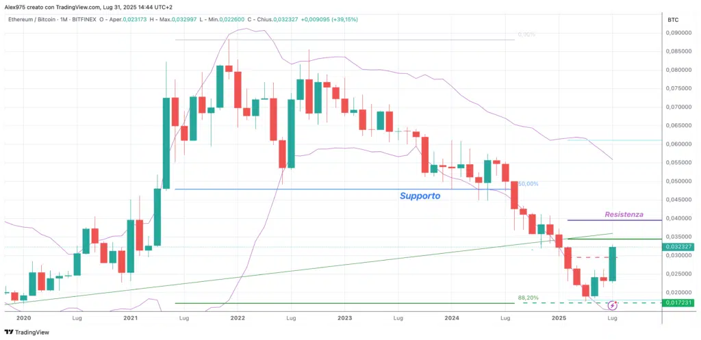 Da quel livello si è avviata una fase di rimbalzo, con un’accelerazione evidente nel mese di luglio, durante il quale il rapporto ETH/BTC ha registrato un +39% e il breakout della prima resistenza in area 0,0295 BTC. Il movimento in corso ora guarda al prossimo obiettivo in area 0,03450 BTC, con la resistenza successiva — e più rilevante — situata in zona 0,040 BTC.