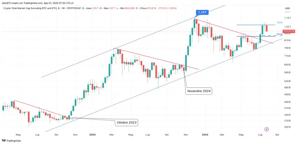La forza delle altcoin può essere osservata anche attraverso la loro capitalizzazione di mercato, rappresentata dall’indicatore TOTAL3, che considera il market cap globale esclusi BTC ed ETH. Dal grafico emerge l’andamento a partire dall’area dei minimi di periodo, toccata nell’estate del 2023.