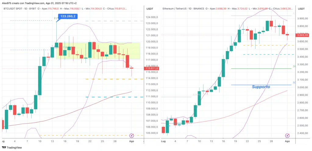 Il rallentamento weekly della TOTAL3 implica che, a livello di altcoin, alcune stanno iniziando a ritracciare rispetto ai massimi di periodo registrati di luglio. Sarà quindi opportuno monitorare con attenzione l’evoluzione grafica delle singole altcoin, alla ricerca di eventuali segnali di pattern di inversione o rotture significative di supporti chiave.