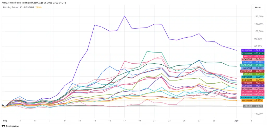 Si è chiuso un mese di luglio che risulta il migliore per la maggior parte delle crypto dai tempi di novembre 2024. Il protagonista principale non è stato Bitcoin (BTC), che comunque ha segnato un nuovo massimo storico (ATH) il 14 luglio a 123.260 USD. Il rialzo mensile di BTC è stato del +8,05%, che contribuisce a una performance positiva del +23,90% da inizio 2025.