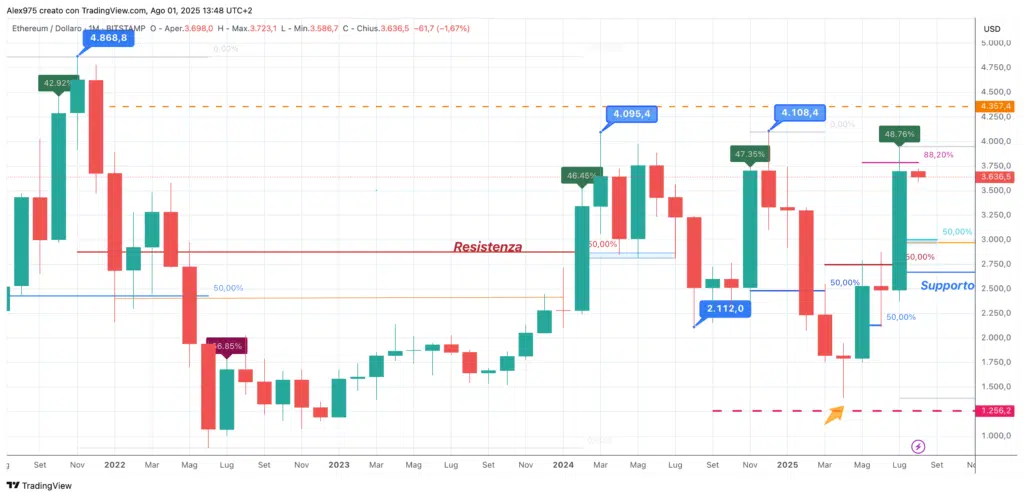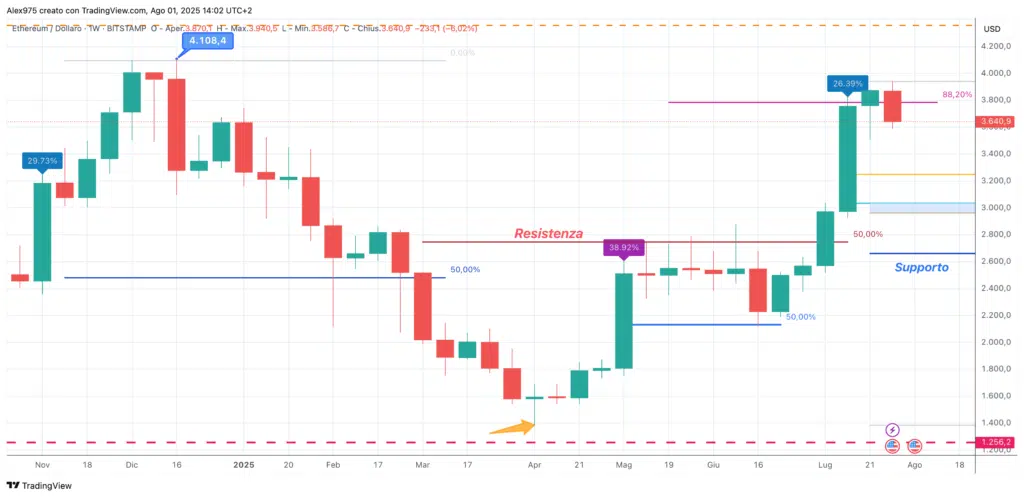 Nel 2025 è ripresa una fase correttiva che ha spinto il prezzo di ETH al minimo di aprile a 1.385$, seguita da un nuovo swing rialzista che ha portato al massimo di 3.940$ registrato lo scorso luglio.