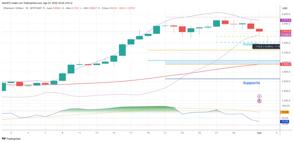 Parlando della situazione di breve termine di Ethereum e analizzando lo scenario in modo analitico, il primo livello di supporto da non violare si colloca in area 3.410 USD. Una discesa sotto questo livello potrebbe innescare una fase discendente, attivando i successivi supporti.