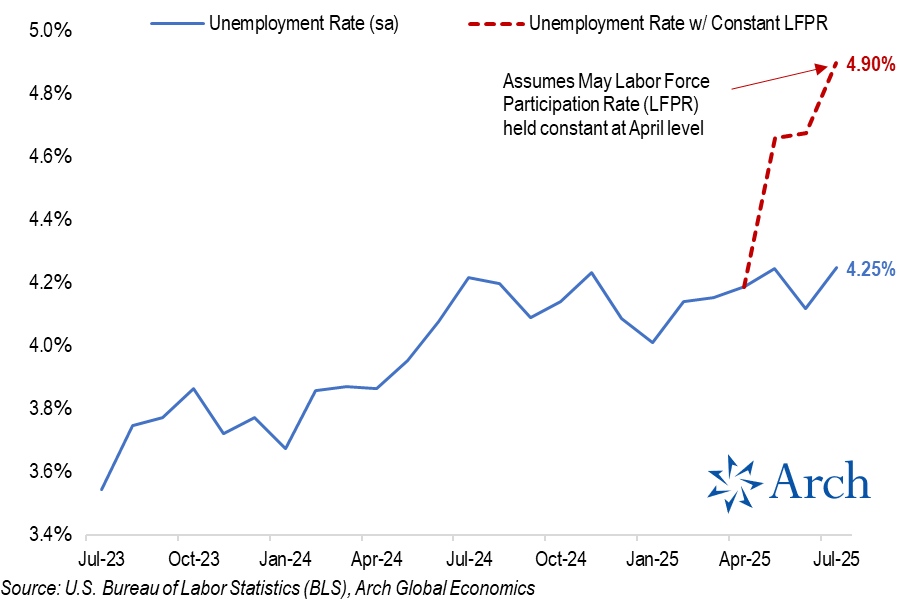 Come si evince dal grafico allegato – se la partecipazione al mondo del lavoro fosse la stessa dei livelli di aprile, oggi saremmo con una disoccupazione del 4,9% e non del 4,2%.