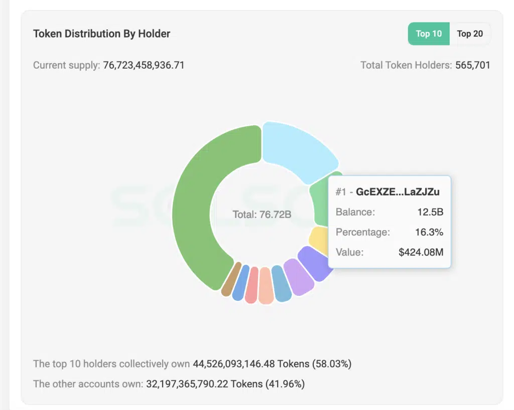 .A luglio-agosto 2025 risultano in circolazione circa 62,86 miliardi di token. Il 58% della supply circolante è detenuta da 10 holders. A farla da padrone è l’indirizzo “GcEXZEUhbK4KyFV7B7q28Zh7PKzGsC3oqgjvGRLaZJZu” con il 16,30% della supply.