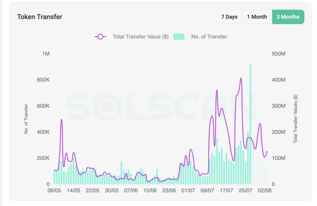 In allegato possiamo osservare l’andamento dei trasferimenti del token PENGU negli ultimi 3 mesi. Si nota un forte aumento sia nel numero di trasferimenti che nel valore totale a partire dall’inizio di luglio, con picchi tra il 10 e il 25 luglio. Il massimo del valore trasferito ha superato i 500 milioni di dollari, indicando forte attività speculativa e probabilmente l’interesse di whale o istituzionali.