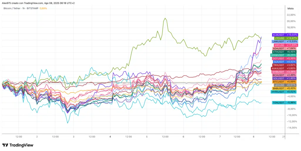 Dal grafico allegato emerge che le due più performanti sono Litecoin e Stellar, in aumento del 15%. A seguire troviamo ChainLink e Ripple, entrambe con tra 12 e 13%%, seguite da Ethereum e Cardano che si attestano su valori simili. Non tutte, però, chiudono il mese in positivo: Toncoin, infatti, risulta ancora in calo di oltre il 5%.
