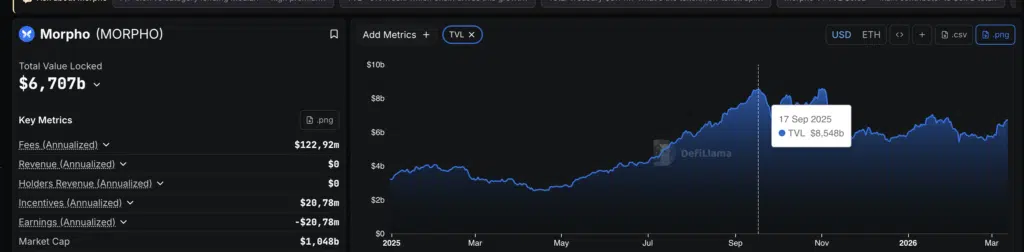 Il grafico del TVL di Morpho mostra una crescita significativa nel corso del 2025. Dopo una fase iniziale attorno ai 3-4 miliardi di dollari, il valore bloccato ha registrato un calo primaverile fino a circa 2,6 miliardi, seguito da una progressiva ripresa. Durante l’estate il TVL ha accelerato con decisione fino al picco di circa 8,5 miliardi a settembre. Successivamente si è osservata una fase di consolidamento, con oscillazioni tra 5,5 e 7 miliardi. Attualmente il TVL torna in crescita verso area 6,7 miliardi, segnalando rinnovato interesse.