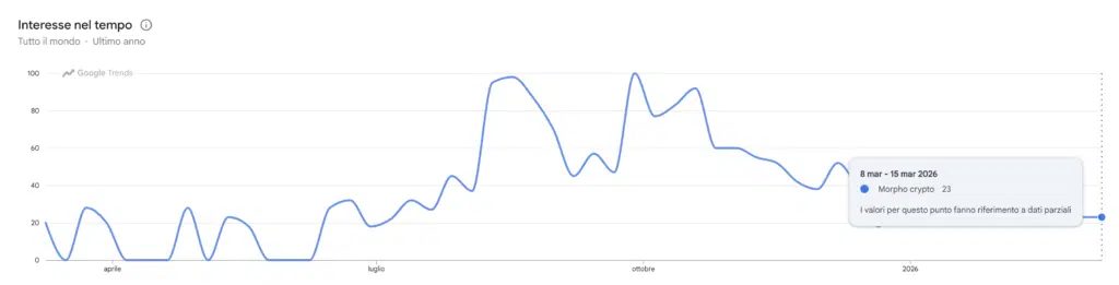 Il grafico di Google Trends mostra l’interesse di ricerca globale per Morpho nell’ultimo anno. L’indice è espresso su una scala da 0 a 100, dove 100 rappresenta il picco massimo di popolarità nell’arco degli ultimi 12 mesi.