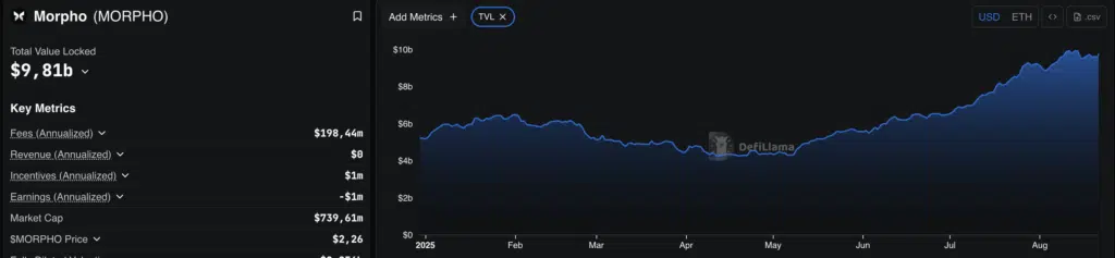 Questo sviluppo punta a consolida l’ecosistema di Morpho, già in crescita nel settore dei prestiti DeFi. La TVL (total value locked) ha toccato il suo massimo storico a 9,81 miliardi di dollari. La piattaforma ha ampliato le integrazioni e reso disponibile la propria Mini App su Base (beta), con depositi in USDC superiori a 1,6 miliardi. Inoltre, Coinbase ha rilanciato lo Stablecoin Bootstrap Fund, destinando liquidità ai pool Morpho.