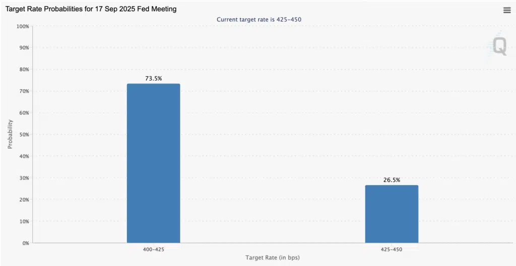Opinione che comunque rimane prevalente, per quanto sia ritenuta possibile con un -10% rispetto ai valori di ieri. Il grafico di Fed Watchtool ieri mostrava i sì tagli a Settembre all’82,4%.