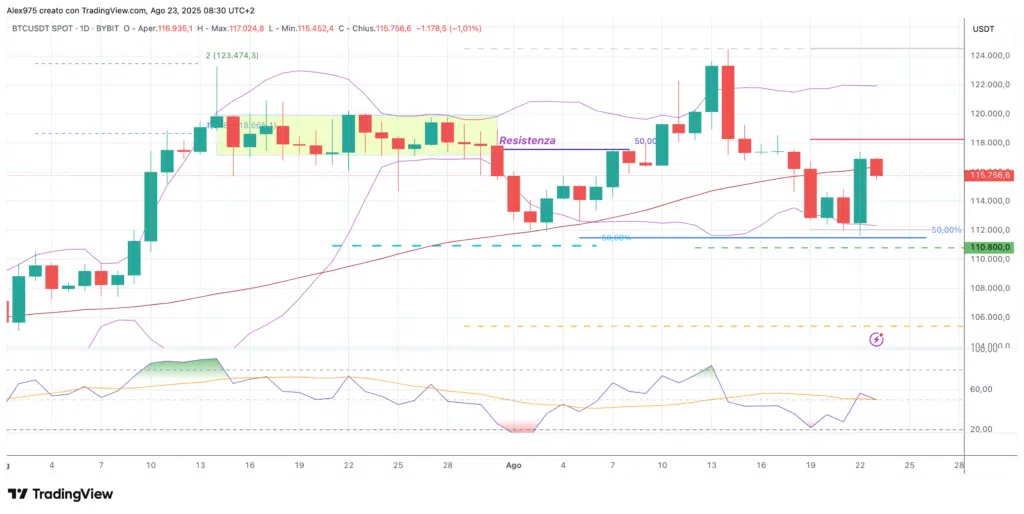 Il mercato crypto ci ricorda che esistono sia la volatilità sia la possibilità di ribassi, come sta mostrando anche Bitcoin (BTC), in questa settiamana. Attualmente BTC quota 115.800$ e in agosto è al momento invariato dopo aver testato ieri un minimo 111.655$. Le parole di ieri di Powell a Jackson Hole, hanno aiutato in mercati, infatti BTC ha poi chiuso in rialzo del 3,93% e S&P 500 a 1,49%