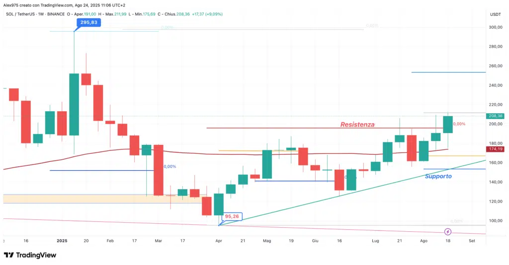 Sul grafico weekly abbiamo una panoramica del prezzo di Solana dal suo ATH di gennaio a 295,83 USDT fino al minimo di aprile a 95,26 USDT. Da quel livello si è avviata una fase di rialzo caratterizzata da una serie di swing, culminata con l’accelerazione di inizio agosto che sta portando al breakout della resistenza in area 200–205 USDT.
