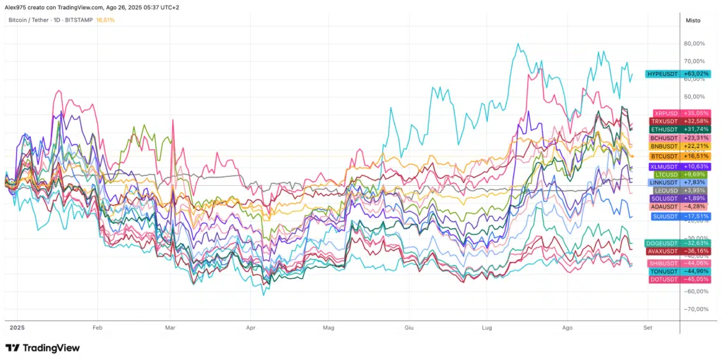 Osservando il grafico di Hyperliquid si nota come, dal massimo storico di luglio, sia iniziata una fase di correzione che ha portato in tre settimane a una perdita massima del 28%, con un minimo a 35,54 dollari. Da questo livello è scattata una fase di rimbalzo che, tuttavia, non è riuscita a superare il massimo precedente.