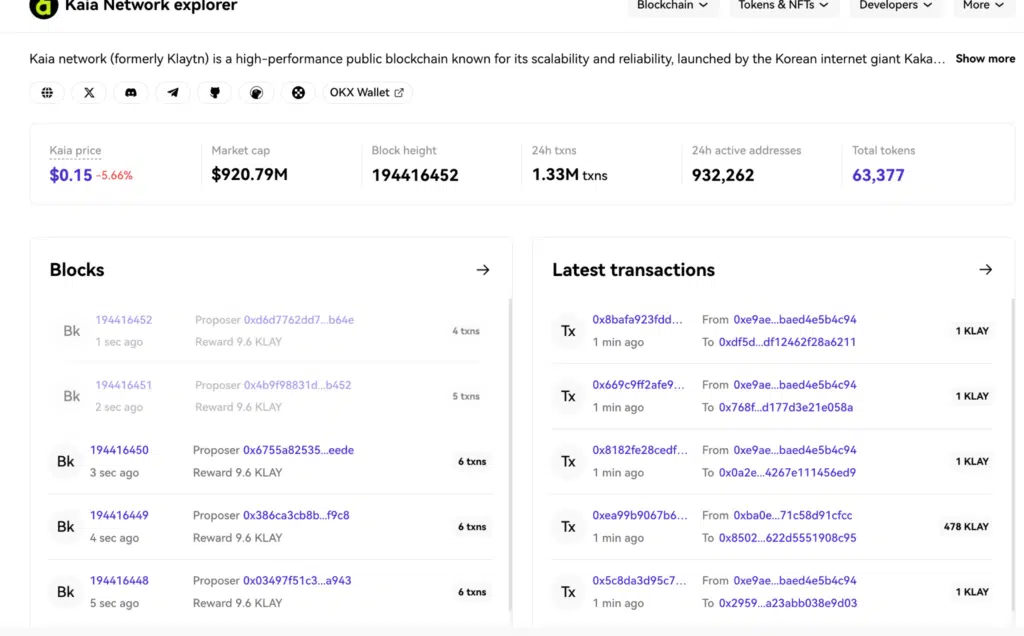 Piattaforme di analisi come Glassnode, CryptoQuant, Artemis o IntoTheBlock non tracciano Kaia, focalizzandosi su asset di più ampia capitalizzazione. I dati on-chain oggi più affidabili arrivano da KaiaScan, OKLink e dashboard dedicati su Dune Analytics, che permettono di monitorare indirizzi attivi, volumi e transazioni.