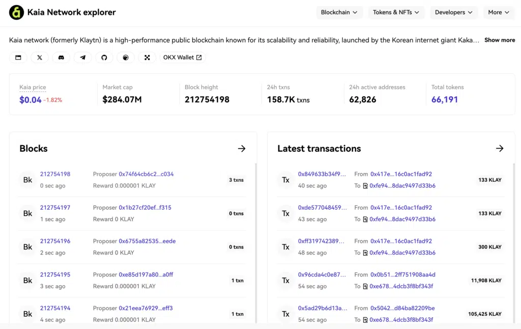 Di seguito la dashboard Kaia Network explorer, evidenziando le principali metriche on-chain della rete. Il prezzo di KAIA è intorno a 0,04$, con market cap di circa 284 milioni.