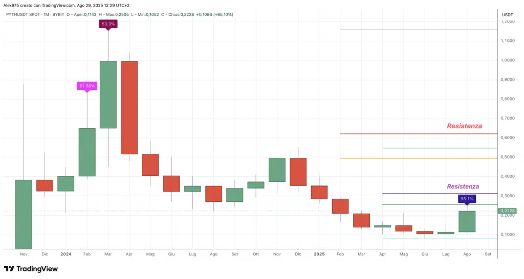 Nell’ultima settimana, alla ribalta delle performance rialziste in un mercato crypto segnato da indecisione, troviamo Pyth Network (PYTH) che, su base mensile, sta registrando un rialzo del +91%. Questo movimento di agosto rappresenta il più alto della sua storia, essendo un token quotato sui principali exchange da novembre 2023.