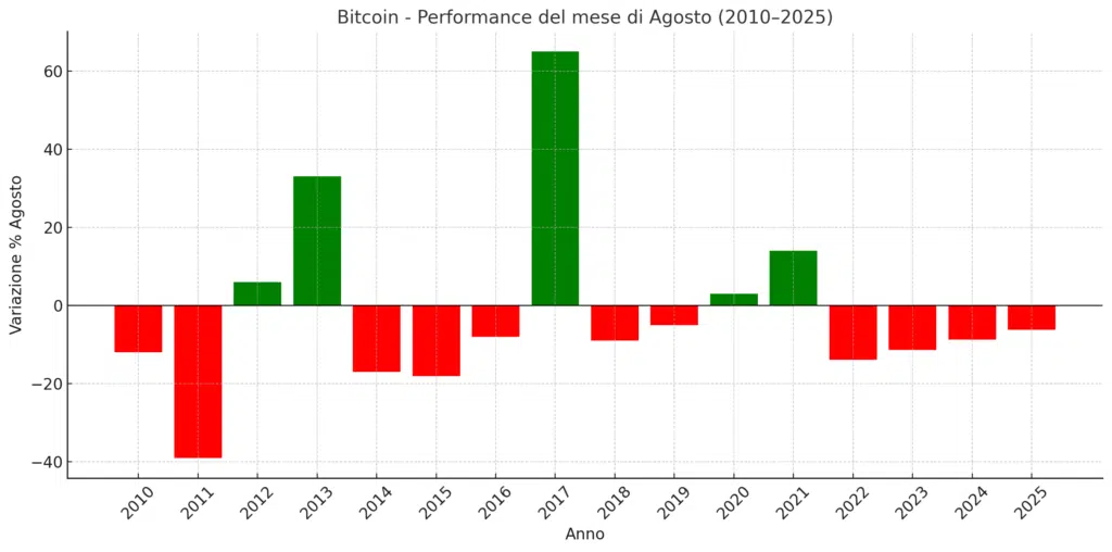 Il peggior agosto resta il 2011 con –39%, mentre il migliore è stato il 2017 con +65%. Negli ultimi tre anni consecutivi (2022–2024) il mese ha registrato solo ribassi, escludendo l’attuale –6,2%. Agosto emerge quindi come il mese statisticamente più sfavorevole per BTC.