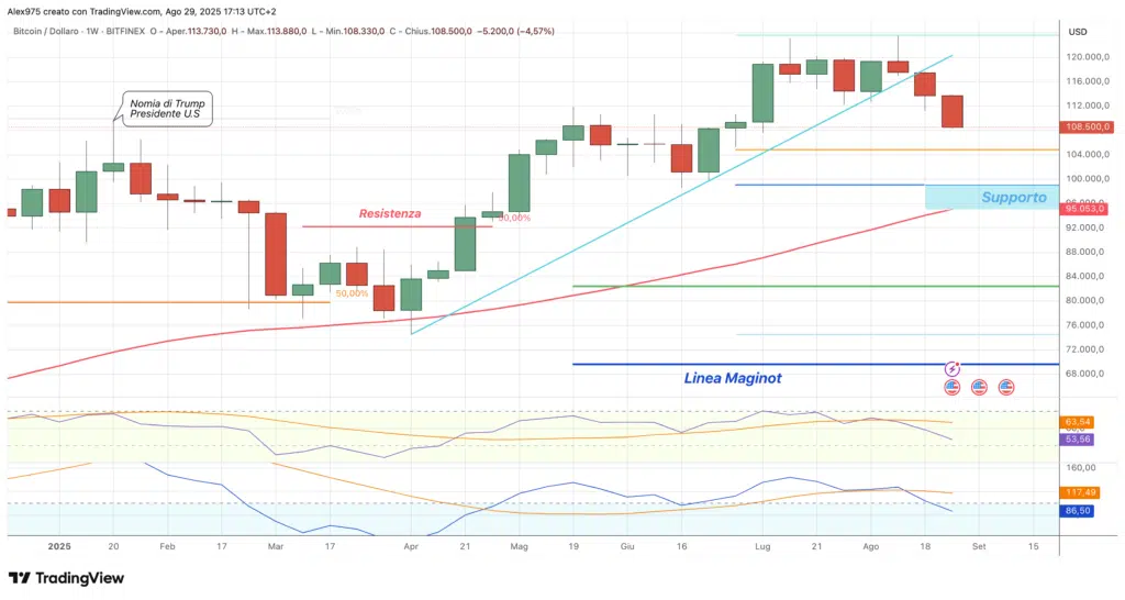 Mercato crypto in contrazione e anche Bitcoin (BTC), nella giornata di ieri ha subito una forte virata negativa e si avvia a chiudere agosto in rosso. Attualmente quota 108.300$ e, su base weekly, è in contrazione del –4,27%, segnando la terza settimana consecutiva in calo, fatto che non avveniva dallo scorso febbriao.