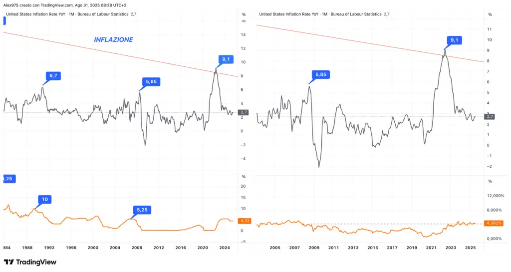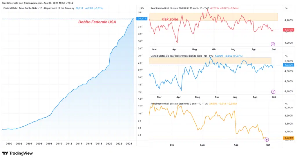 Il debito federale ha superato i 37.000 miliardi, con un costo medio ormai oltre il 3,3%. In questo scenario cresce il rischio di fiscal dominance: la necessità di finanziare un debito sempre più ingente potrebbe condizionare le scelte della Fed, spingendo verso politiche monetarie meno indipendenti. Se i tassi restassero elevati per contrastare l’inflazione, il peso degli interessi sul bilancio pubblico diventerebbe insostenibile, costringendo la banca centrale ad allinearsi alle esigenze fiscali di Washington.