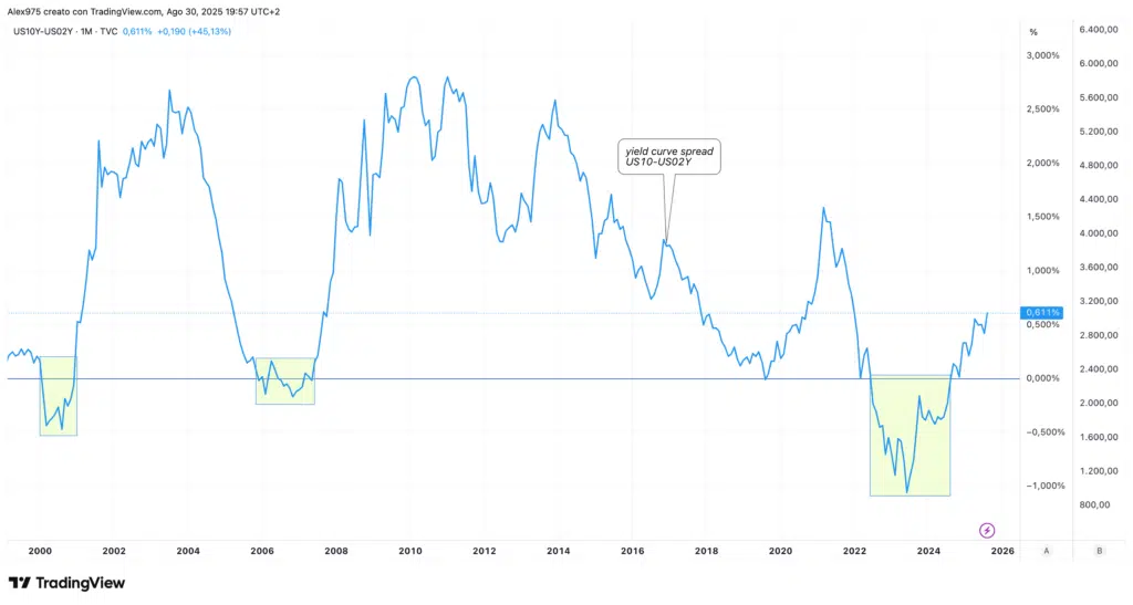 Nel 2025 la curva dei rendimenti mostra un quadro particolare: i Treasury a 30 anni rimangono su livelli elevati, mentre i decennali e soprattutto i biennali hanno iniziato a scendere, con il 2 anni attestato al 3,62%. Questo movimento indica che il mercato si aspetta futuri tagli dei tassi da parte della Federal Reserve, dopo due anni di politica aggressiva. È la classica fase di steepening della curva, con i lunghi che restano più redditizi e i brevi in calo.